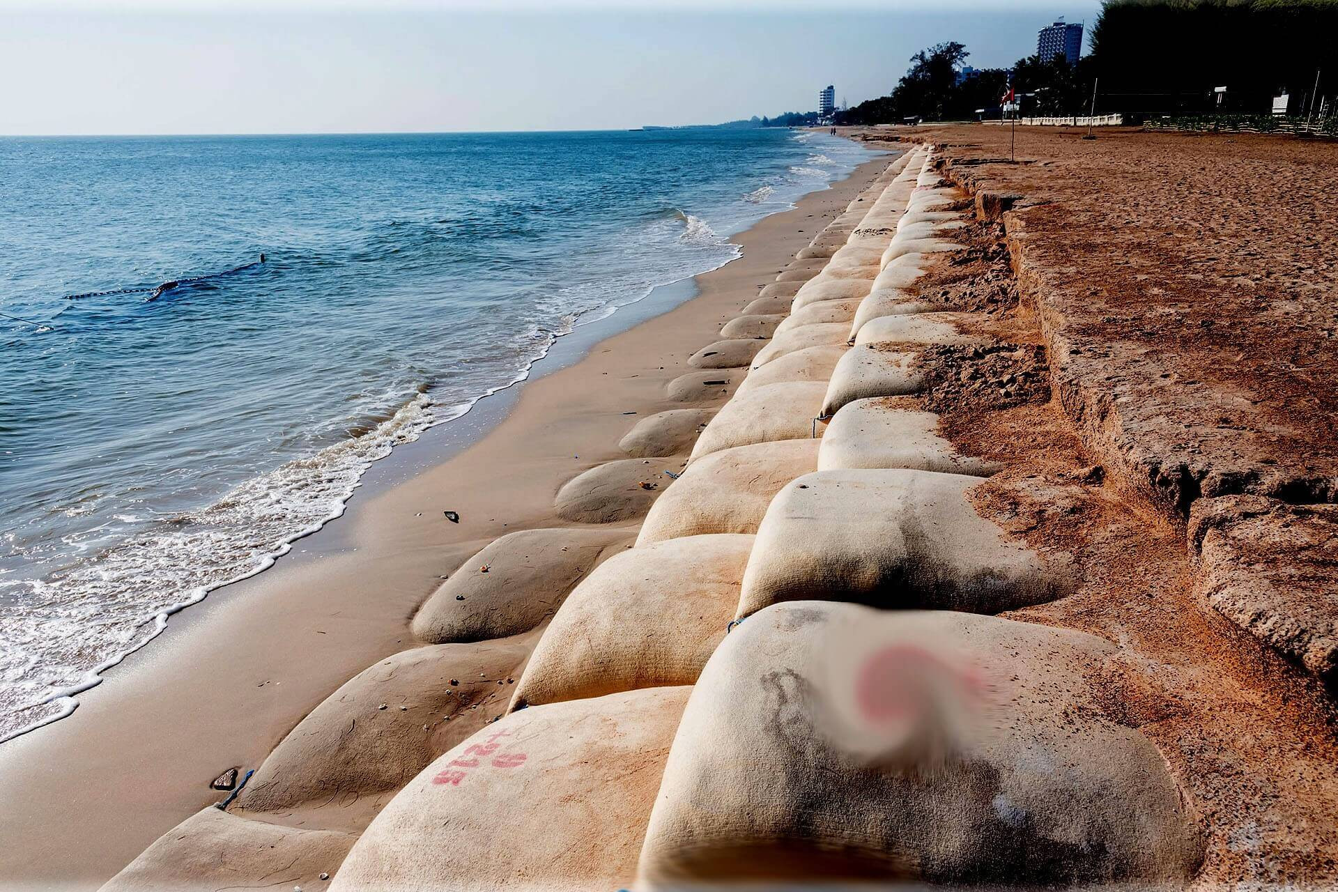 Instalación de geotubos de polipropileno tejido de alta resistencia con el sistema tecnológico de geocontencion, bombeados de arena para controlar la erosión costera y atenuar el oleaje incidente.